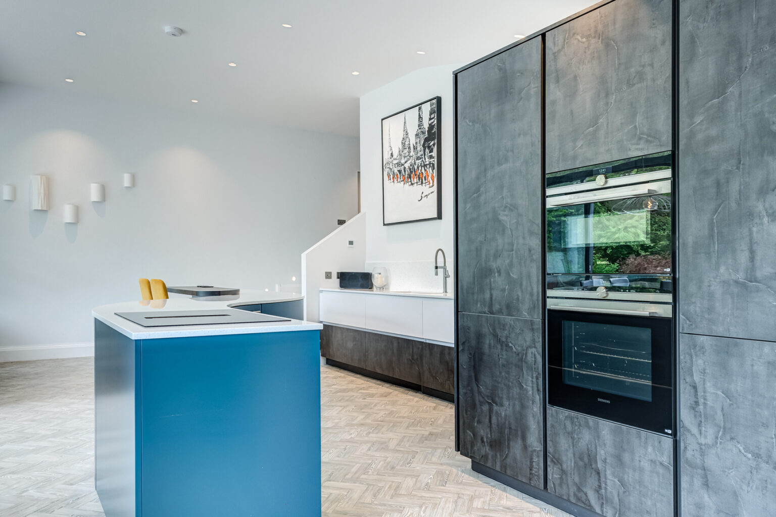 This Schmidt Swansea kitchen captures the essence of modern living with its daring use of colour and texture. The deep blue island immediately commands attention, creating a vibrant focal point, while the sleek grey cabinetry introduces a sophisticated, urban edge. Polished worktops and integrated appliances bring seamless functionality, ensuring the kitchen performs as beautifully as it looks. The open layout encourages connection, making it the perfect space to cook, entertain, and gather.