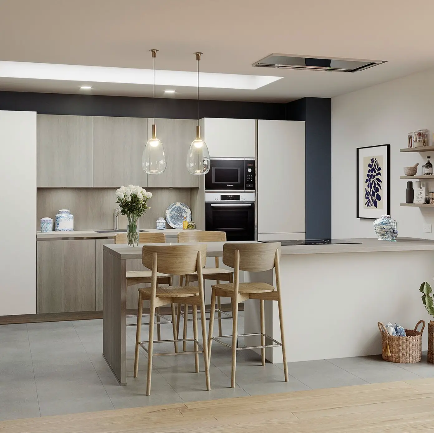 Soft neutrals, warm oak tones, and clean architectural lines come together in this bespoke family kitchen. The pale timber cabinetry and open shelving bring a light, Scandinavian feel, while the waterfall island doubles as a relaxed breakfast spot and effortless prep zone. Pendant glass lighting adds a gentle glow, and fully integrated appliances keep the look streamlined and uncluttered.