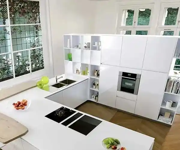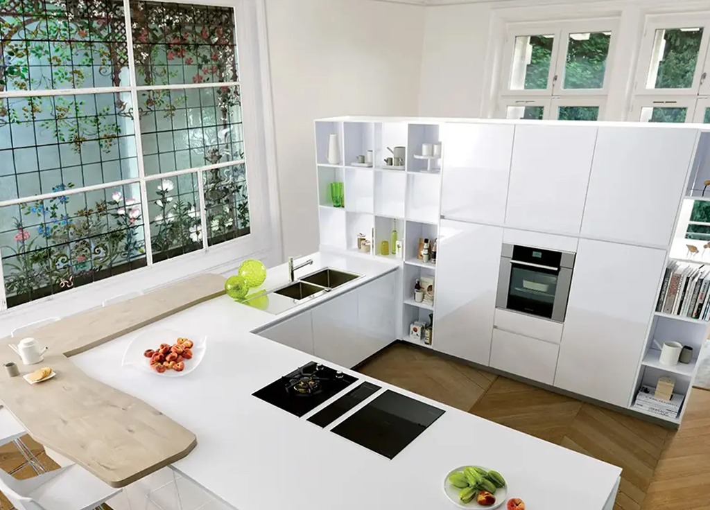 This contemporary kitchen captures the essence of light, space, and simplicity. Crisp white cabinetry with a high-gloss finish reflects natural light beautifully, creating a bright and airy atmosphere that feels open and refreshing. Integrated shelving adds both function and style, allowing everyday items and decorative pieces to sit seamlessly within the design.